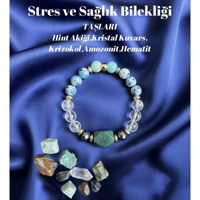 Stres ve Sağlık Destekleyici Doğal Taş Bilekliği | Hint Akik – Kristal Kuvars – Krizokol – Amazonit – Hematit | Enerji Dengeleyici ve Ruhsal Rahatlama Bilekliği
